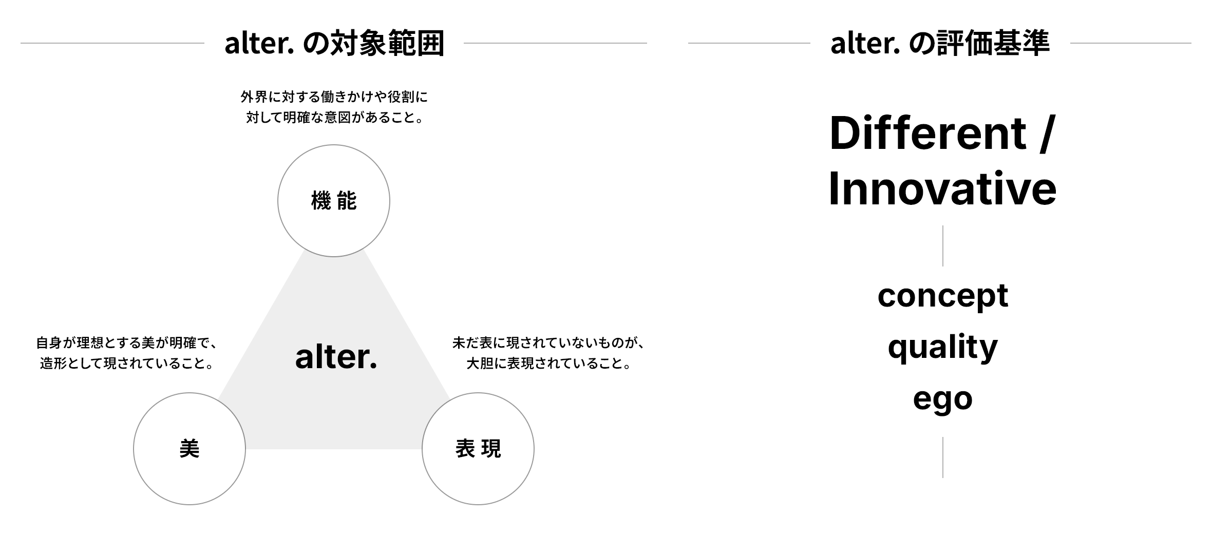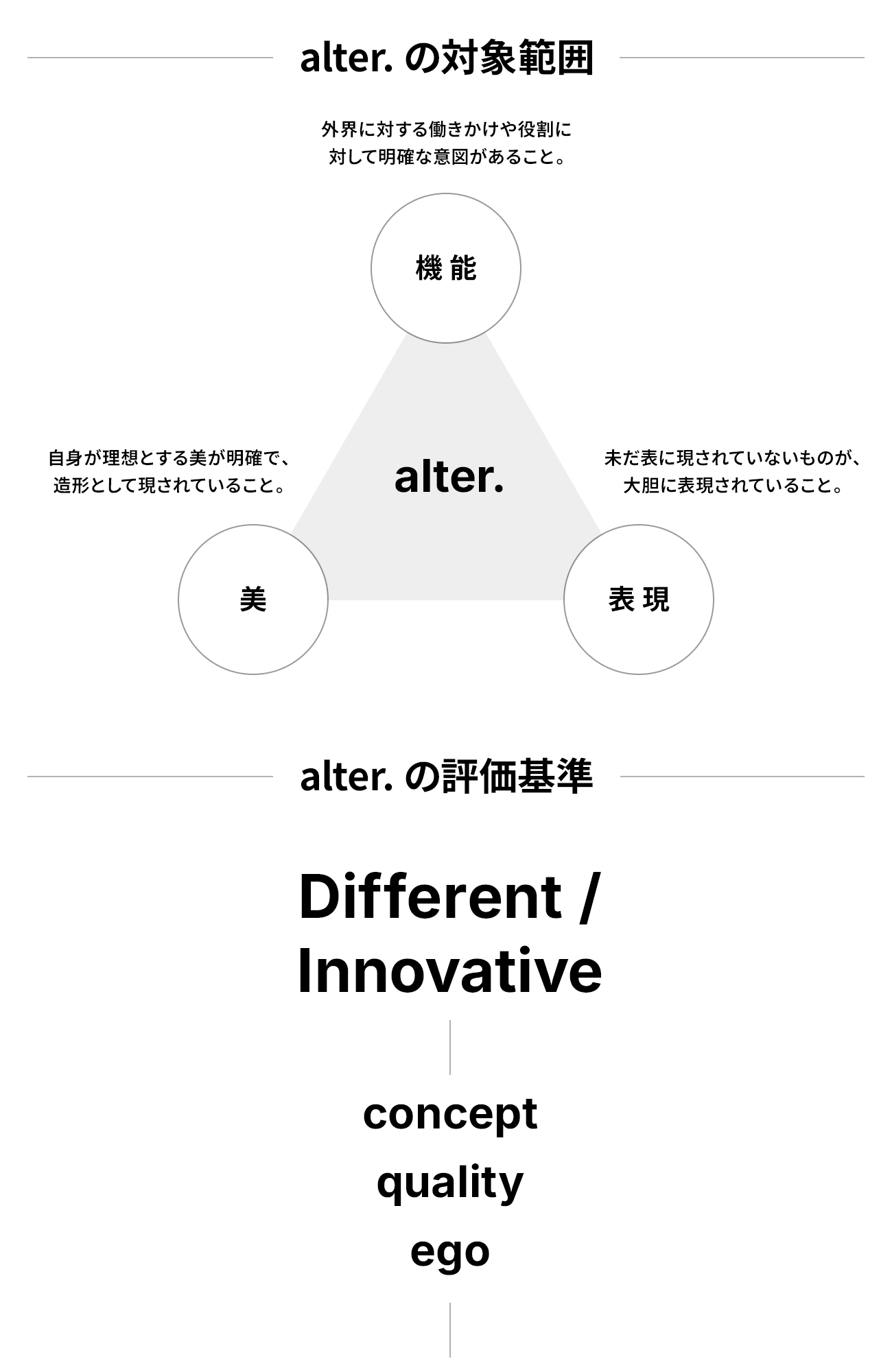 alter. が対象とするプロダクトは、以下の3つの観点において独自のコンセプトを持ち、強い個性と既存概念への挑戦が感じられるものとします。また、審査対象は展示プロダクトのみならず、展示全体のコンセプトや、展示・プレゼンテーション方法も含まれます。応募作品は、新作・旧作を問いません。ただし、過去作品を展示する場合は、そのままではなく、新たな視点やコンセプトを加えてキュレーションしてください。